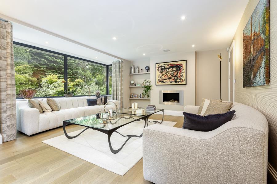 A striking double-sided fireplace anchors the layout and provides warmth and atmosphere, dividing the seating zones without disrupting the open-plan flow. Multiple seating areas allow the room to adapt easily for family living, quiet relaxation or larger gatherings. Richly upholstered sofas in soft neutral and jewel tones add depth and comfort, while artwork and accessories give the space an eclectic yet curated edge.