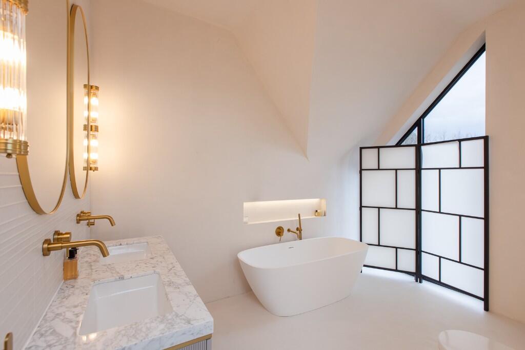 This en-suite bathroom is a statement of modern luxury, designed with clean architectural lines and an elegant palette. A freestanding bathtub forms the focal point, positioned beneath a striking feature window with frosted paneling that balances privacy and natural light.
