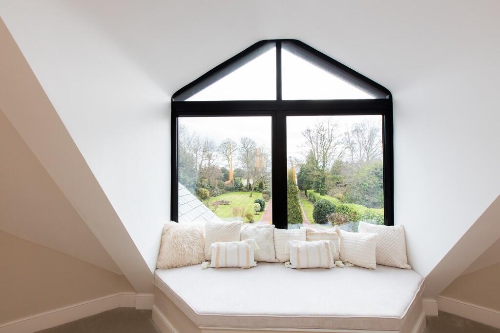 The principal bedroom suite is a haven of light, space, and serenity. Set beneath vaulted ceilings and framed by striking architectural lines, this room combines contemporary design with a sense of calm sophistication. A dramatic picture window with black-framed glazing floods the space with natural light while offering sweeping views across the landscaped gardens.